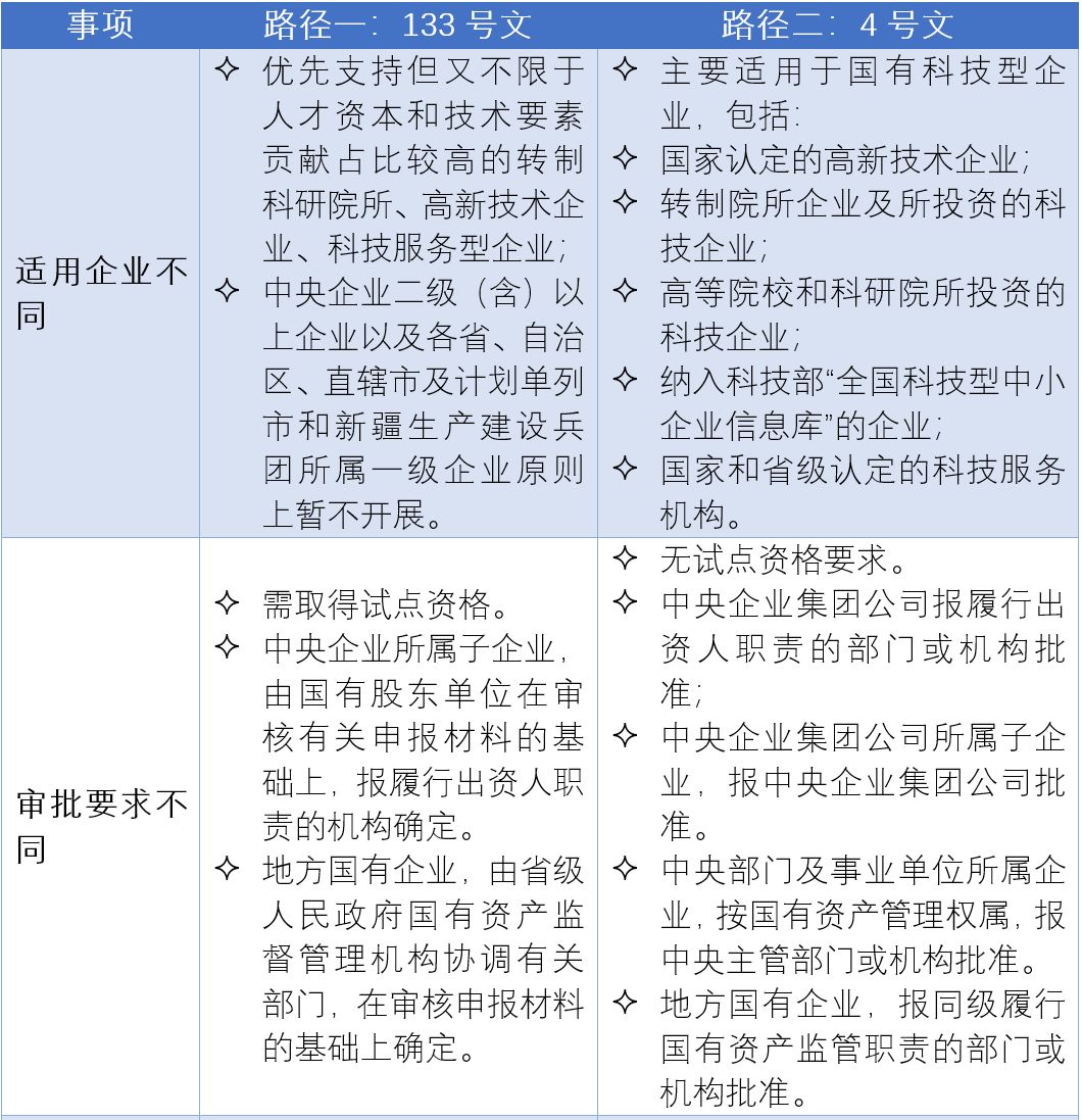 對于非上市的國有背景公司而言,開展員工持股有兩條基本路徑可供選擇。其一是遵循“133號文”的相關(guān)規(guī)定開展員工持股,其二則是依據(jù)“4號文”及其配套制度的相關(guān)規(guī)定實施員工持股。但是,目前開展員工持股試點的企業(yè)多以“133號文”的規(guī)定為依據(jù),適用“4號文”進行員工持股的企業(yè)相對較少。因此,下文對員工持股的一般操作流程和具體要求的梳理也主要圍繞“133號文”展開。兩種路徑在適用企業(yè)、審批要求、持股比例限制、鎖定期要求等方面存有差異,各有優(yōu)劣。具體如下: